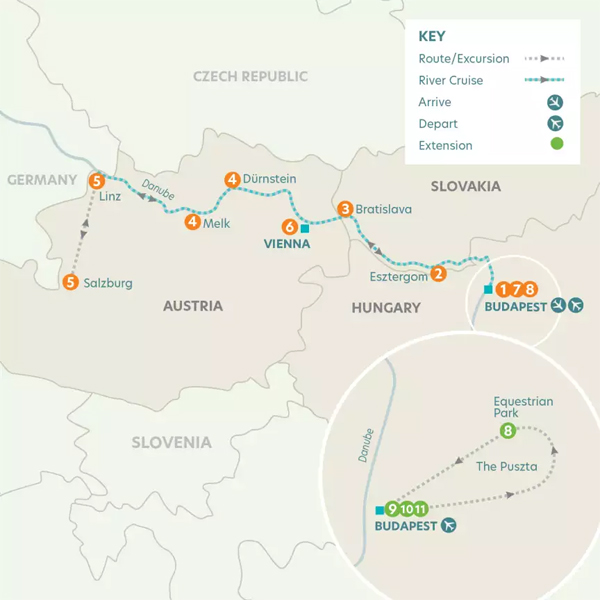 Enjoy one of our most popular river cruises - The Blue Danube - but with a three-night extension in Budapest added on to take your holiday to a whole new level.After seven nights cruising along the Danube river and exploring historic destinations - including some of Europe's cultural highlights in Budapest, Esztergom, Bratislava, Dürnstein, Melk, Linz, Salzburg and Vienna - you can discover more of majestic Budapest’s imperial past and the 19th-century grandeur of the Habsburg Empire. Delve into the charming, old-world atmosphere of medieval Buda, stroll along the broad boulevards of elegant Pest and venture into the scenic Puszta, Hungary’s Great Plain, on this superb three night extension.