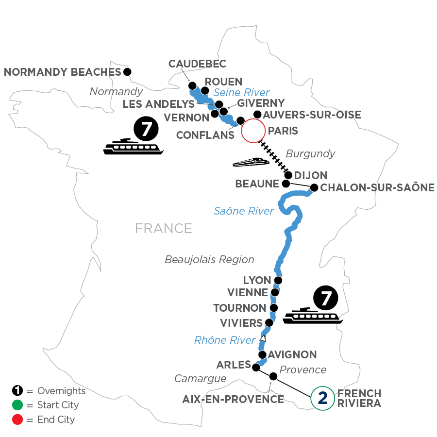 This incredible European river on the Rhône, Saône, and Seine Rivers highlights the best of France. Begin your adventure on the French Riviera before cruising. On the Rhône River from Arles, France—famous for inspiring the paintings of Van Gogh—and its 1st-century Roman Amphitheater. On a guided tour of historical Avignon, see the 14th-century Palace of the Popes—the largest Gothic fortress in the world. Take a guided walk through the city of Tournon, beautifully nestled among vineyards and a medieval treasure of Roman ruins and a fascinating 16th-century castle. Visit Lyon, France’s gastronomic capital and a showcase of medieval and Renaissance architecture. On your Seine River cruise, you’ll have the choice of seeing the historic Normandy Landing Beaches, including Omaha Beach, the Pointe du Hoc monument, and the American Cemetery; the delightful Les Andelys, Joan of Arc’s Rouen, Vincent Van Gogh’s Auvers-sur-Oise, or Napoleon and Josephine’s Malmaison. On this French river cruise, you’ll enjoy wine, cheese, beautiful views, and stops in the most charming parts of France. Your vacation in France would not be complete without a stay in Paris—one of the world’s most romantic and vibrant cities! Discover its true heart on a guided walk through the sites of Paris’ rich history, or take a tour to see the iconic sites of this enchanting city. Walk in the footsteps of the great master artists, enjoy the delectable cuisine of France, and stand where heroes fought for freedom on the beaches of Normandy. This and so much more is waiting for you on your French cruise on the Seine!**During the Olympics and Paralympic games some venues and areas might be closed or not accessible to groups, therefore the program might be subject to change.