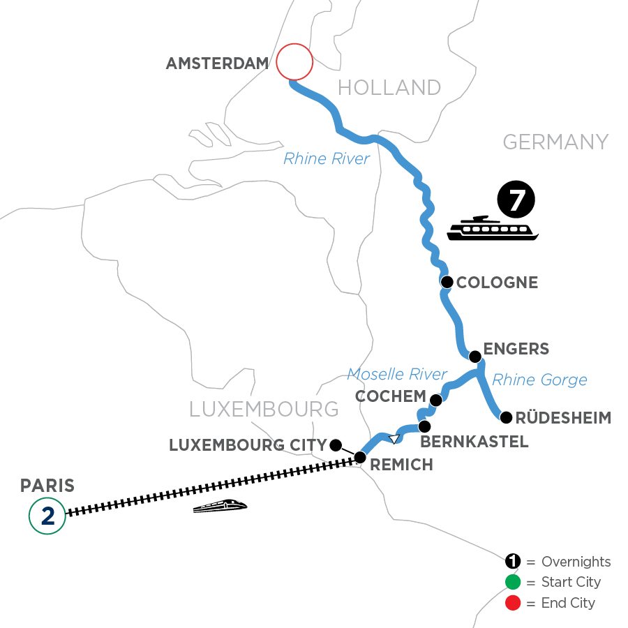 Begin your Avalon YourWay river cruise vacation with two nights in romantic Paris before your cruise. Explore the “City of Light” with a guided city tour to see all the must-see sights! Take a high-speed train from Paris to Luxembourg City and board your Avalon Suite Ship® in Remich on the beautiful Moselle River. Enjoy a guided walk in the charming wine village of Bernkastel and taste some of the region’s best wines. Cruise the Moselle River to the picturesque town of Cochem where the Riesling grape is cultivated. Sail onto the Rhine River to the quintessential Rhine valley town of Rüdesheim. Here visit the marvelous Mechanical Musical Instruments Museum and enjoy a stroll through the town’s famous cobblestone Drosselgasse lined with shops, restaurants, and lively taverns. Cruise through the dramatic Rhine Gorge—the most beautiful stretch of the Rhine River where ancient castles stand on cliffs 400 feet above the water. On a guided walk, see the famous twin-spired cathedral of Cologne, and explore the cobblestone streets of the Old City. Visit Holland’s popular, modern capital of Amsterdam, and see this 700-year-old city from a unique perspective—on a canal cruise along the elegant Grachten. Your European river cruise on the Rhine and the Moselle Rivers takes you to both the spectacular and the charming destinations of France and Germany.