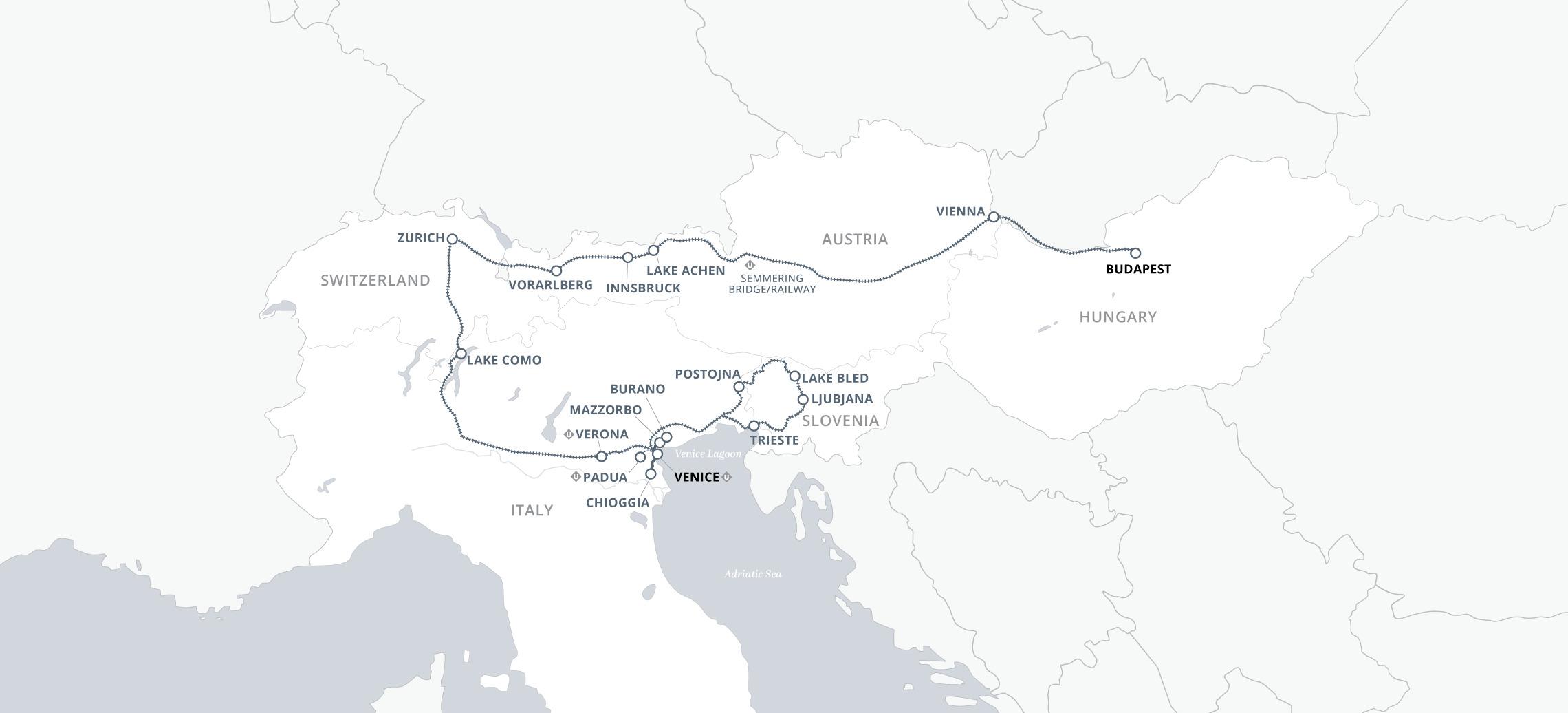 Begin your journey in the stunning cities of Budapest and Vienna, from which you’ll ascend into the idyllic wonderland of the Alps via a luxury overnight train. Your days will be filled with unbelievable mountain scenery, picturesque lakes, and unforgettable experiences. Enjoy lunch on Lake Como, sample Swiss fondue in Zürich, head into Slovenia’s Postojna caves on a private visit, and more. Then travel to romantic Venice and treat yourself to the ultimate Venetian vacation, perfected by one unique quality: your stay onboard our floating boutique hotel. Not only will you benefit from an enviable location in Venice, but you’ll also find that your hotel transports you to hidden gem towns nearby.