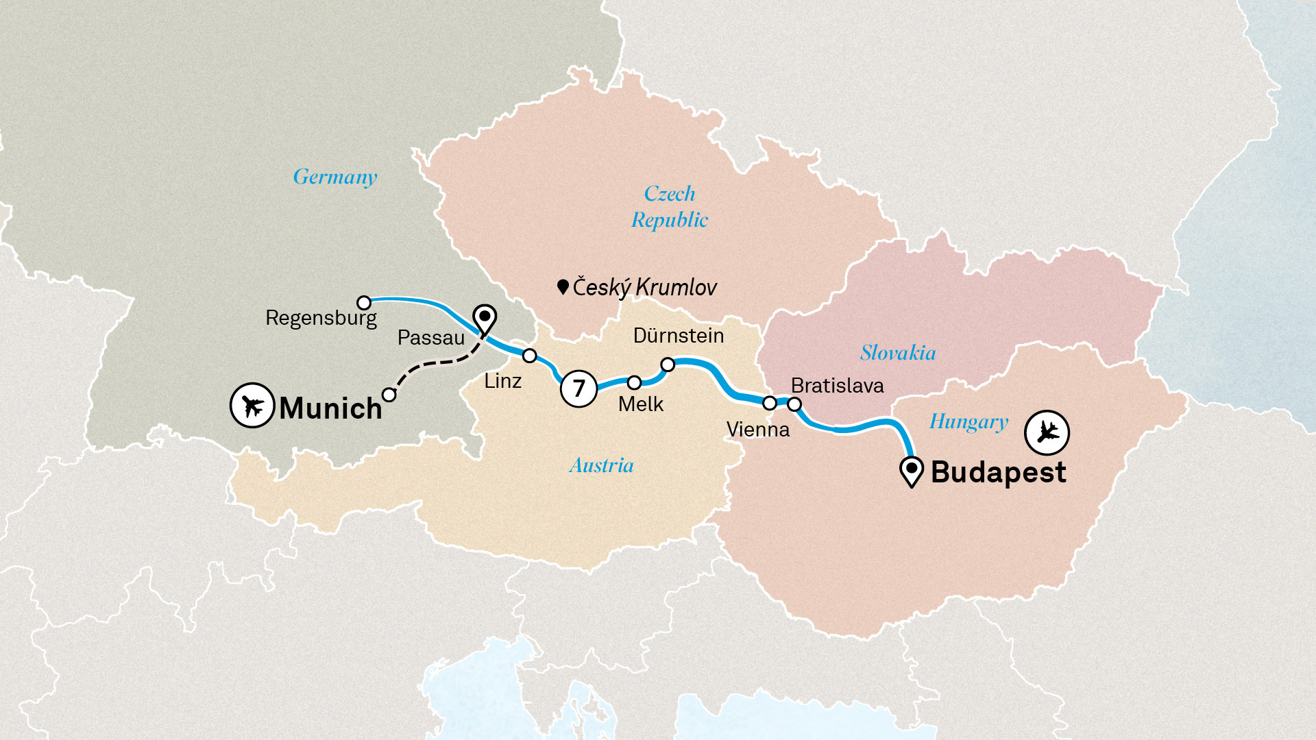 - Day 8Passau > MunichTue, Apr 13, 2027Your journey concludes this morning. After one final breakfast on board, depart with a lifetime of memories. Please book your flight to depart out of Munich after 12:00 PM. This itinerary is a guide only and may be amended for operational reasons such as high and low water. As such, the cruise may operate altered from that stated above. Please refer to our terms and conditions. Please note: Preview itinerary subject to change.