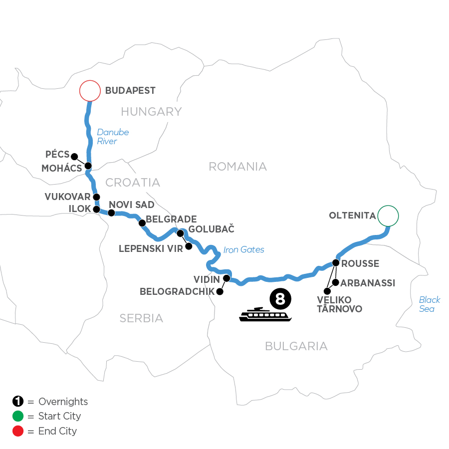 Embark your river cruise along the beautiful Danube River to Budapest in Oltenita, Romania. Enjoy guided sightseeing in Bulgaria’s ancient capital of Veliko Tarnovo, and visit the Ethnographical Museum and Church of the Nativity in Arbanassi. Take pictures of Belogradchik’s eclectic group of rock formations and the spectacular views as you cruise through the Iron Gates Gorge. Visit Belgrade, the capital of Serbia, and one of the oldest cities in Europe. Continue up the Danube and take an excursion to the ancient city of Pécs, Hungary. These and countless other memorable moments await you on this fascinating Danube River cruise through Eastern Europe.