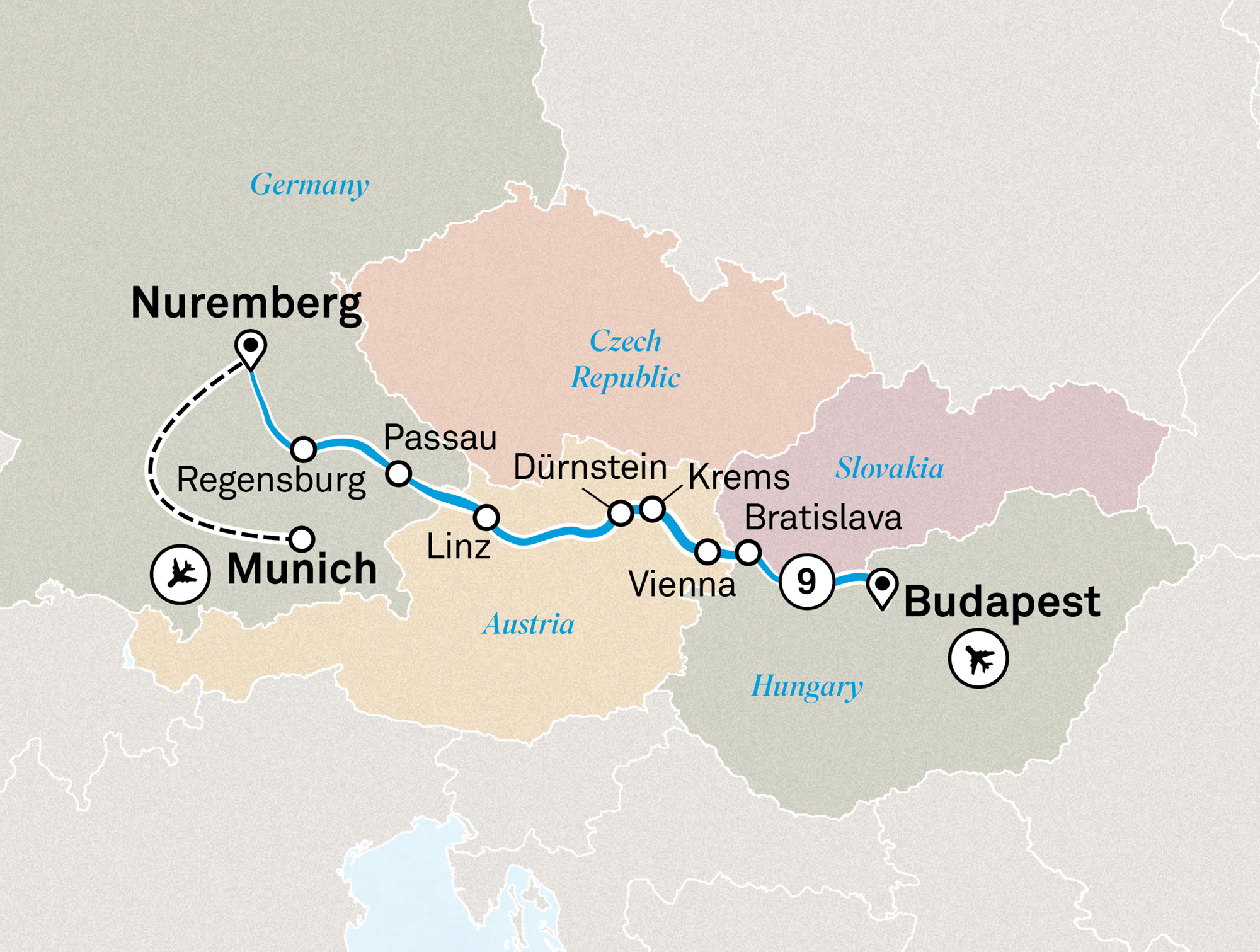 Great trip but way too much busing between Passau and Regensberg and Nuremberg. They should have offered hotels. 6.5 hours round trip to Nuremberg and 4 to Regensberg.