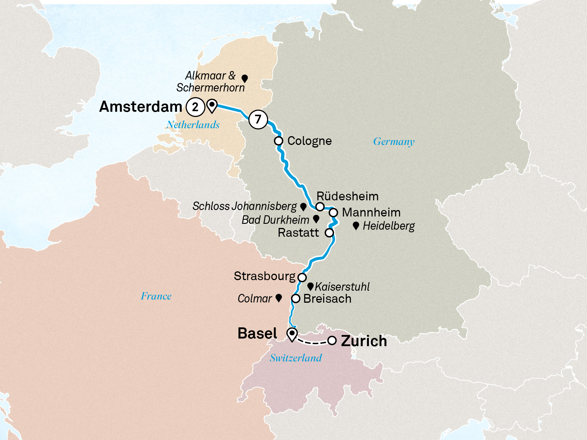 Your cruise finishes this morning in Basel. Savour one final breakfast on board before you disembark, taking with you a lifetime of memories of the wonders and wines of the Rhine.