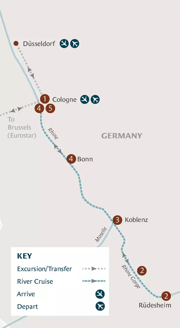 - Day 1Cologne, GermanySat, Dec 05, 2026Arrival in Cologne - On arrival, see your five-star cruise ship moored in historic Cologne, whose skyline is dominated by the spires of its magnificent cathedral. The dedicated English-speaking crew welcomes you on board and helps you to your cabin.After settling into your spacious and tastefully furnished accommodation, there’s time to familiarise yourself with this splendid ship.