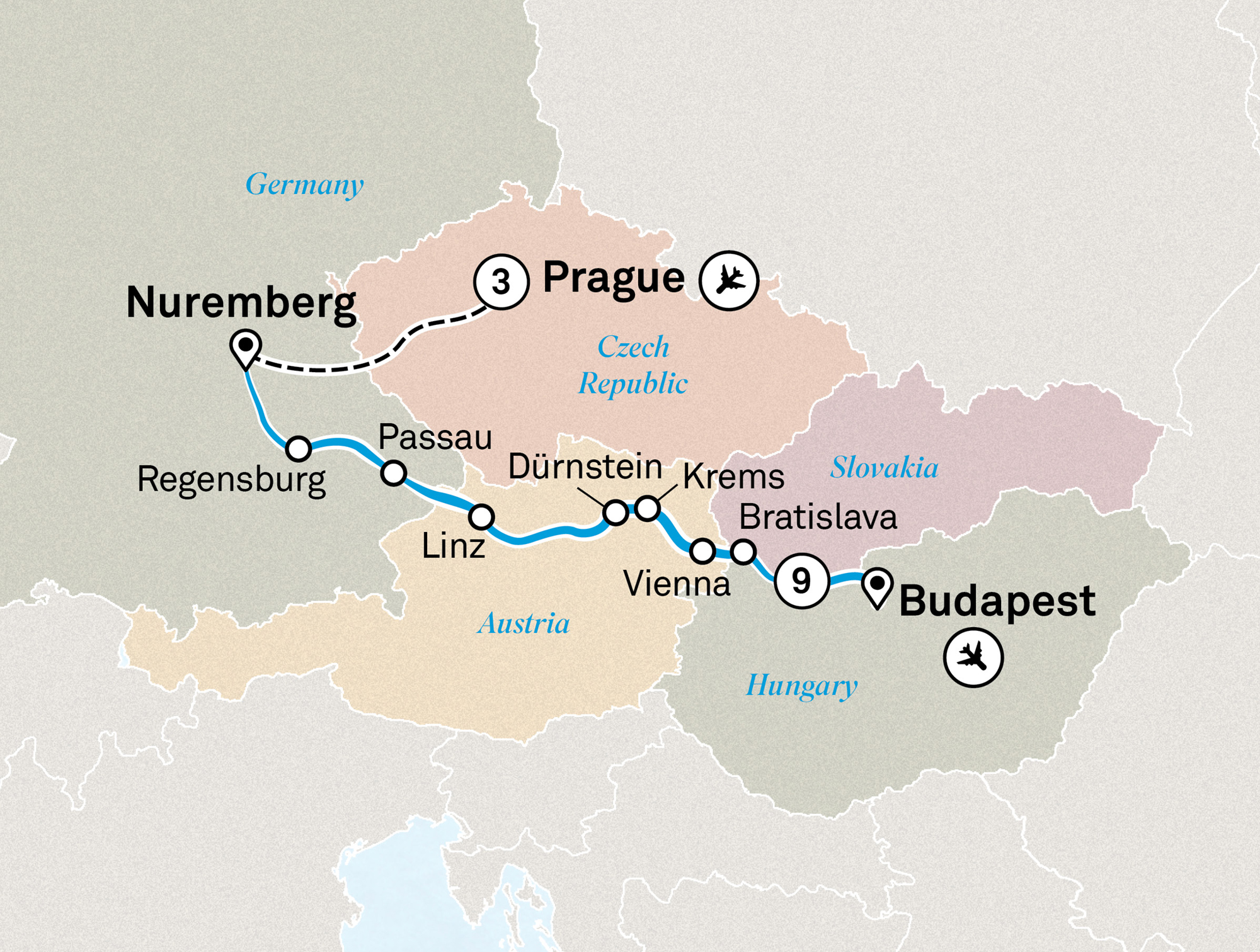 Great trip but way too much busing between Passau and Regensberg and Nuremberg. They should have offered hotels. 6.5 hours round trip to Nuremberg and 4 to Regensberg.