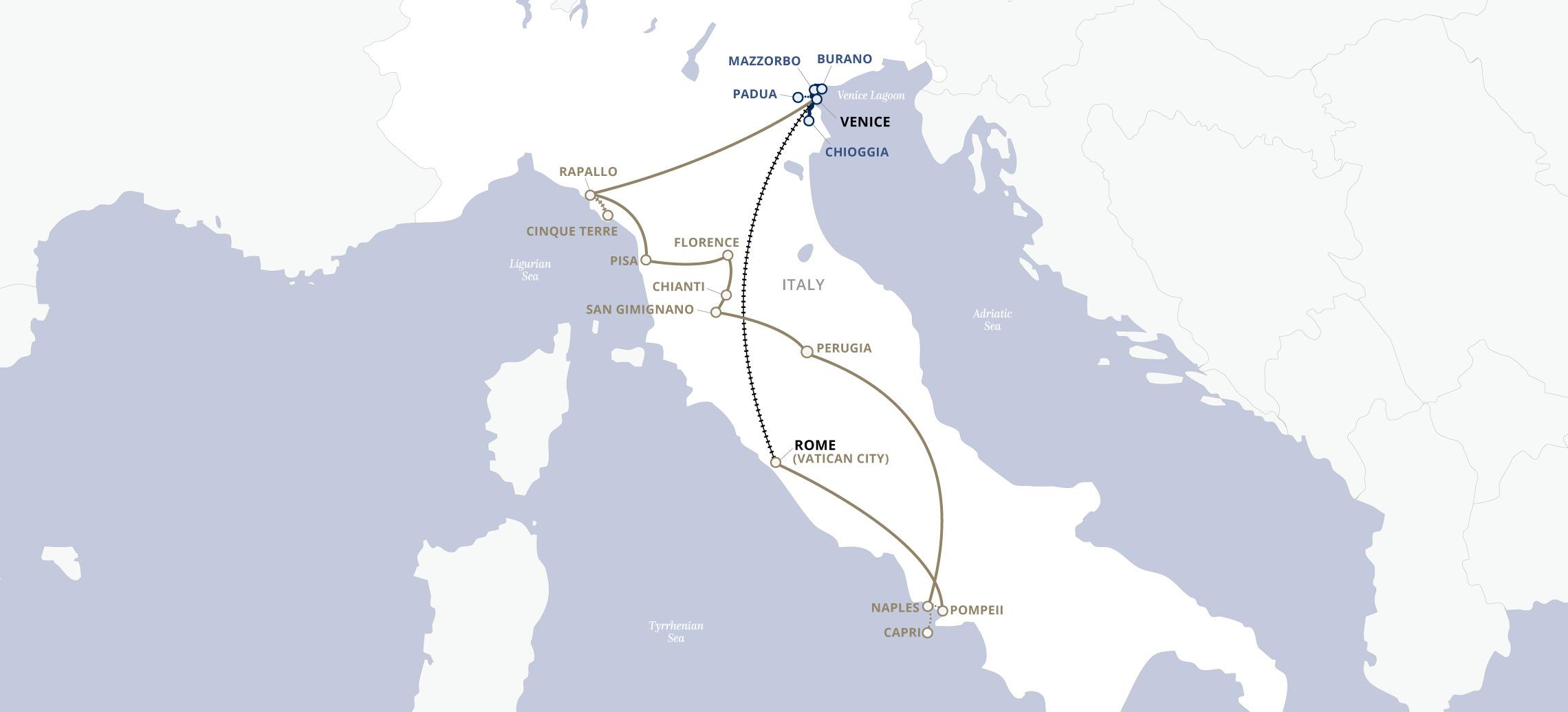 Meals: Breakfast, Lunch, Dinner - Day 8Venice (Disembark), Transfer to Rome via High-Speed TrainSun, May 16, 2027Say arrivederci to the S.S. La Venezia and journey to Rome via high-speed train to begin our land tour of Italy. Tonight, savor a delicious meal with your fellow guests.