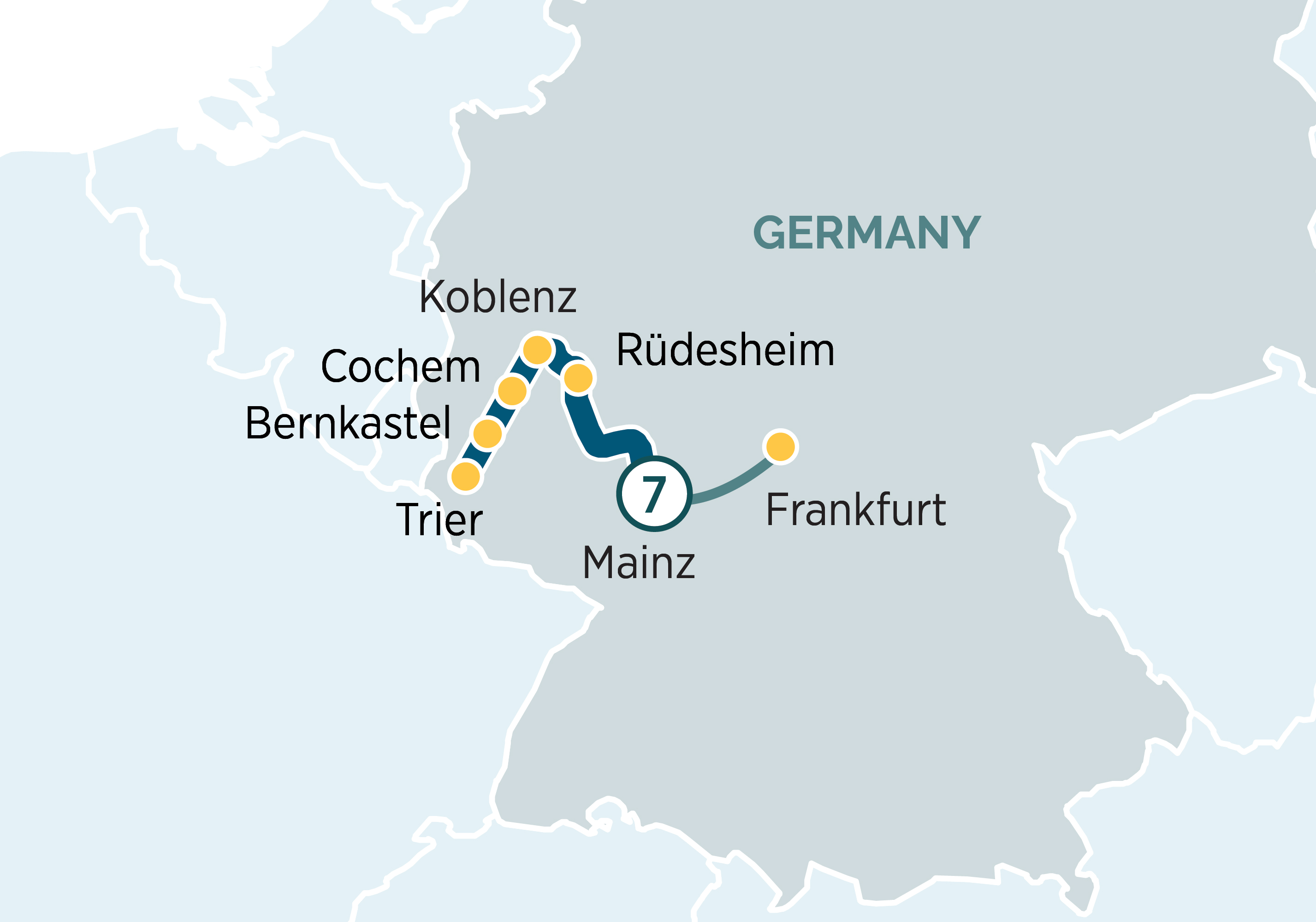 This morning, after breakfast, it’s time to bid farewell to your fellow guests and disembark your Star-Ship for your transfer to Frankfurt airport, leaving with cherished memories of the wondrous treasures of the Rhine and Moselle.